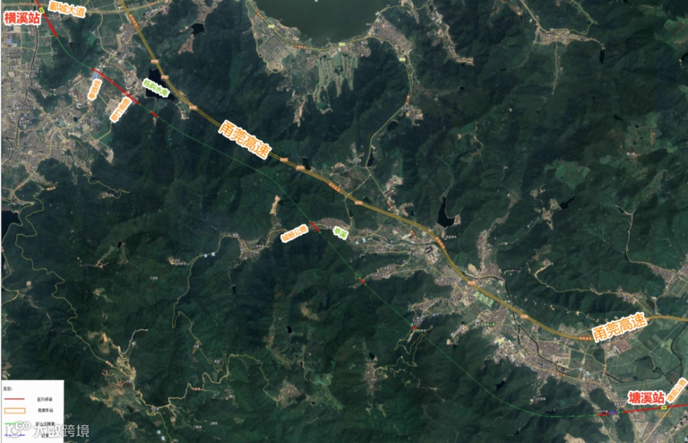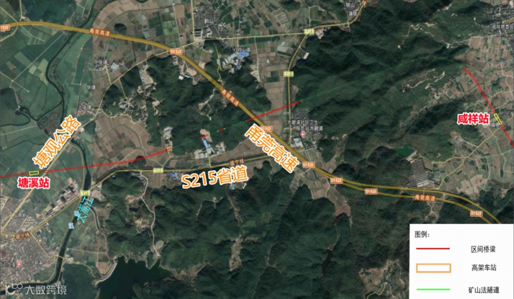 本段线路自塘溪站引出,上跨塘观公路、大嵩江后折向北走行,穿越山体、上跨甬莞高速, 后引入咸祥站。
