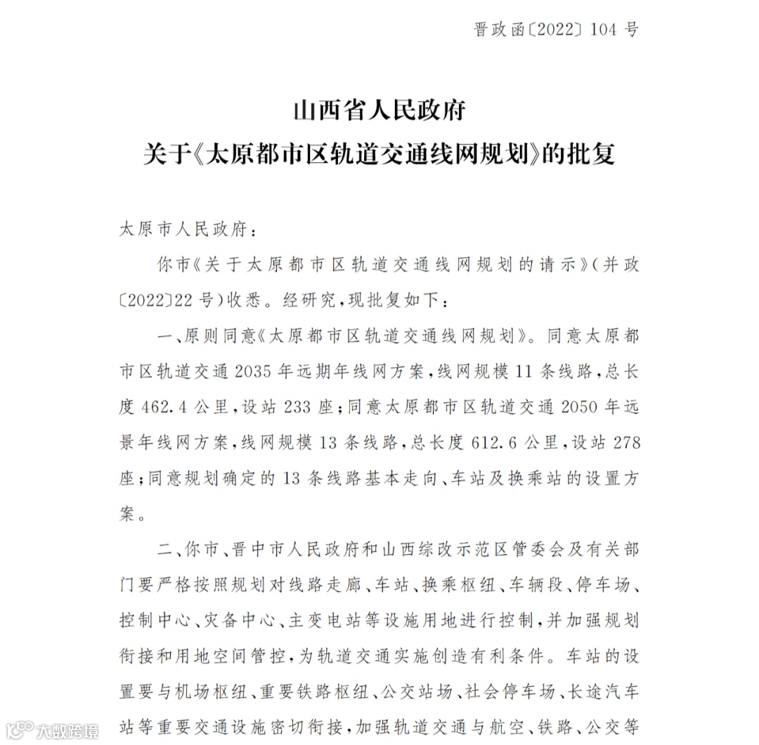 你市《关于太原都市区轨道交通线网规划的请示》(并政〔2022〕22号)收悉。经研究,现批复如下:
