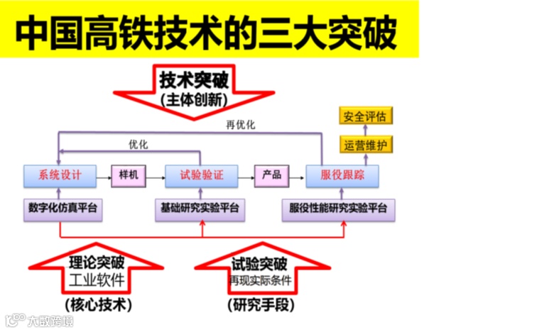 上图表示高速列车新产品研制的全过程。新产品的研发主要是创新主体——制造企业大量技术突破的积累。但是,技术突破的成功,需要有理论突破和试验突破的支持。获得和推广应用后面这两个突破,确保我国高速列车安全平稳高速的运行,是TPL国重为生产服务最具体的表现。