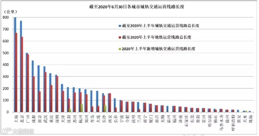 据统计,截至2020年6月30日,中国内地已有41个城市开通了城市轨道交通,总长度达到6917.62公里。2019年新增温州、济南、常州、徐州、呼和浩特5个城市,2020年,新增天水1个城市。
