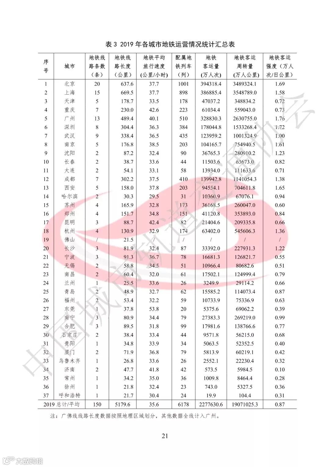 以下是中国城市轨道交通协会发布的2019年各城市地铁运营情况统计汇总表: