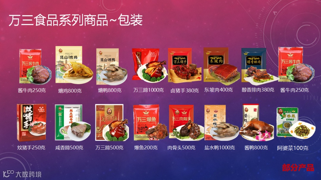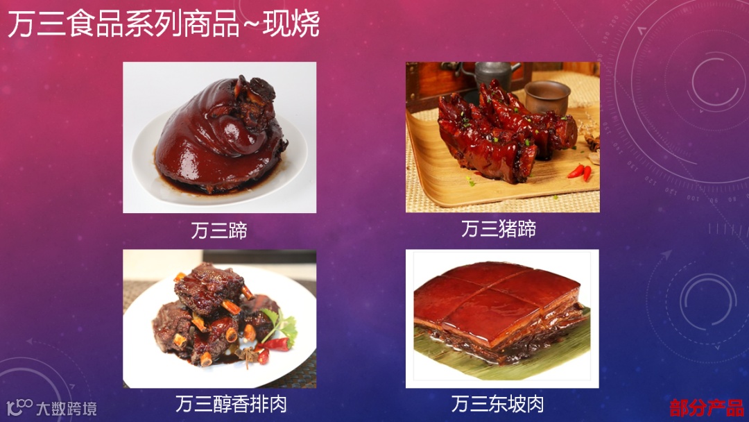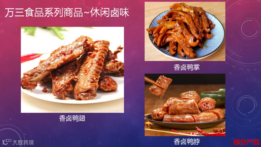 除了经典万三蹄,公司还开发了丰富多样的产品。现烧系列有醇香的万三东坡肉等,休闲卤味系列包含香卤鸭翅、鸭掌、鸭脖等。