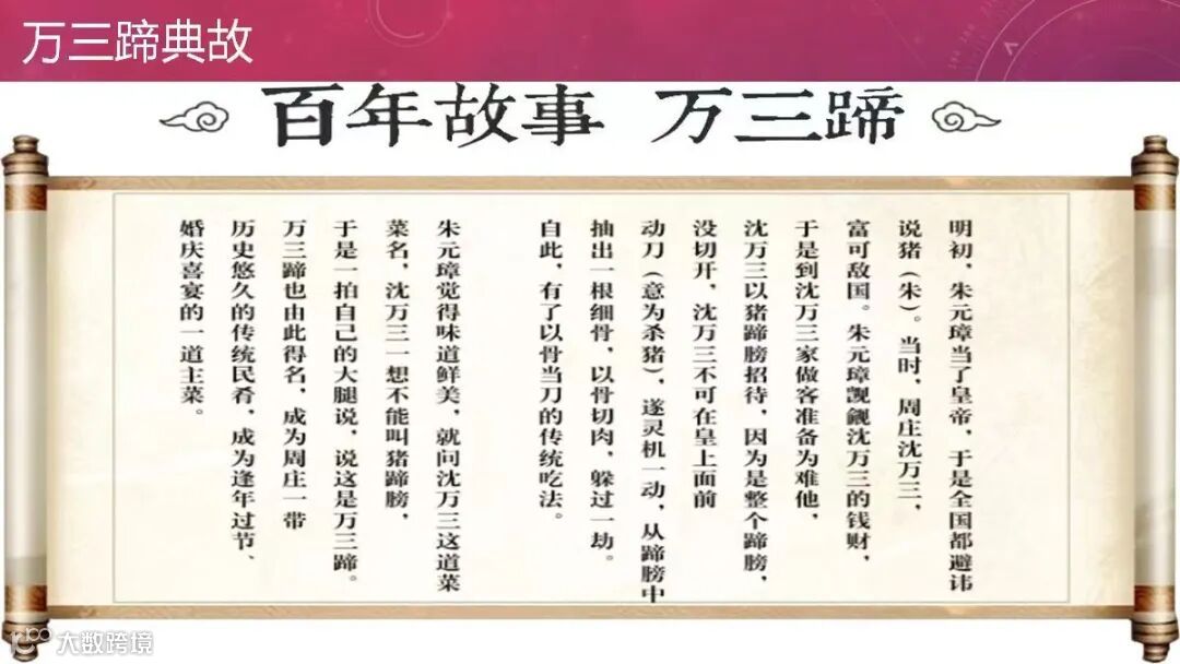 万三蹄的故事要追溯到明初,当时富可敌国的沈万三以猪膀招待朱元璋。因避讳“猪(朱)”字,沈万三灵机一动,从蹄膀中抽出细骨以骨切肉,由此便有了这道美食及其独特吃法。