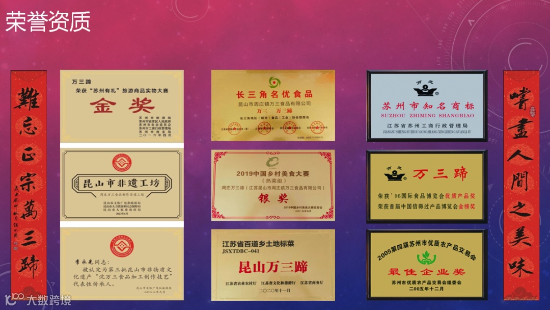 凭借卓越品质,万三蹄荣获众多荣誉,如“苏州有礼”旅游商品实物大赛金奖、长三角名优食品、江苏省百道乡土地标菜等;还获得了96国际食品博览会优质产品奖、首届中国信得过产品博览会金榜奖等诸多殊荣,这些奖项是对其品质的高度认可。