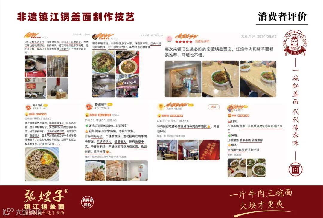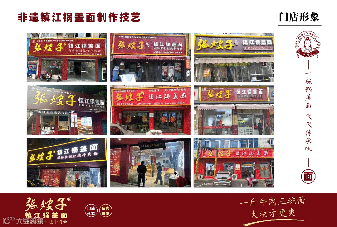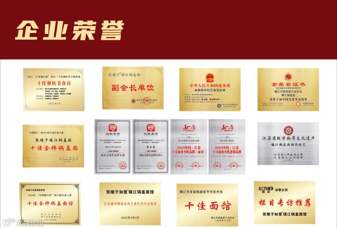 张嫂⼦镇江锅盖⾯馆由张⽟⻰先⽣传承祖辈 的技艺,于2007年创⽴⾄今,注册了“张嫂⼦”及“张嫂⼦锅盖⾯”商标;两届荣获镇江市⼗佳⾦牌锅盖⾯馆、镇江⼗佳⽹红打卡地、中国地标美⻝代表性企业、中国地标美⻝传承⼈等称号。并于2023年获得中国商务部的商业特许经营备案,同年获得江苏餐饮协会颁发的2023中国江苏⼗⼤⾯⻝⼩吃连锁品牌。主打招牌红烧⽜⾁⾯(⼀⽄⽜⾁三碗⾯),⽼少皆宜,交⼝称赞。历经数年开设加盟和学员⻔店 达60余家,⼈员包含了退伍军⼈、创业⼤学⽣、退休⼈员、下岗职⼯等近百余⼈。