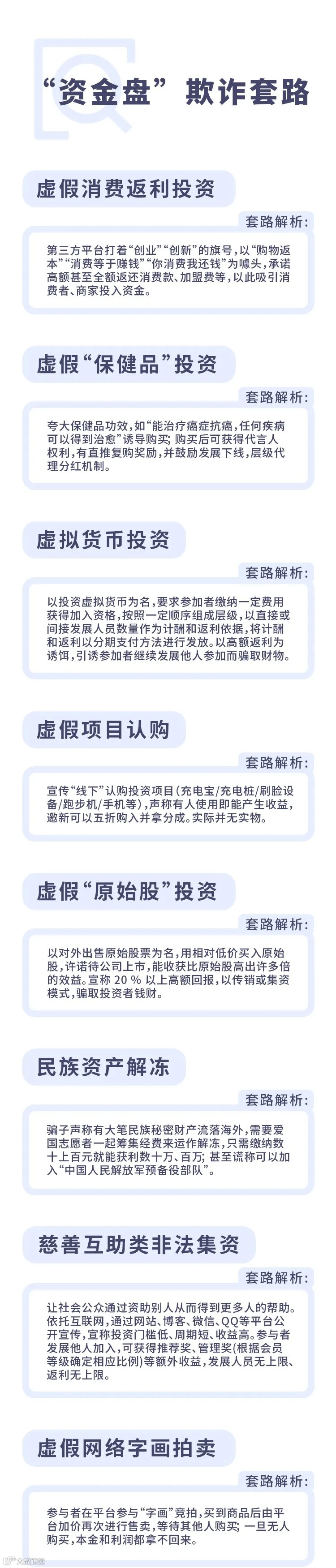 "资金盘"是一种和庞氏骗局相似的诈骗手法。骗子通过巧立名目,炮制出各种打着高回报幌子的投资项目,营造虚假的高回报现象,进而吸引更多的人参与进来。但所谓回报根本不是来自投资项目盈利,而是用后期新投资者的钱支付给前面的老投资者,一旦后面没有新来的人把钱投入进来,那么承诺给前面老会员的高额收益,自然无从达成。