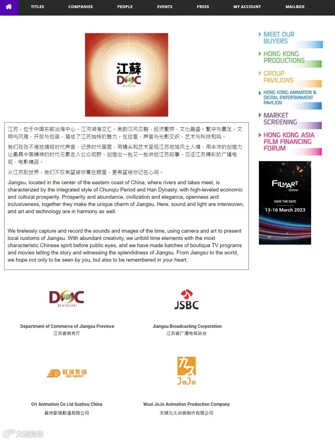 3月14日至17日,由香港贸发局举办的“香港国际影视展(线上展)”(FILMART Online),连续四日在线举行。受到疫情影响,此次展会依然通过网上商贸平台促进环球影视娱乐业界的交流合作。由江苏省广播电视总台领衔,江苏共20家动漫、影视企业参与,成立线上版“江苏馆”,展现江苏影视文化实力,对接海内外资源。