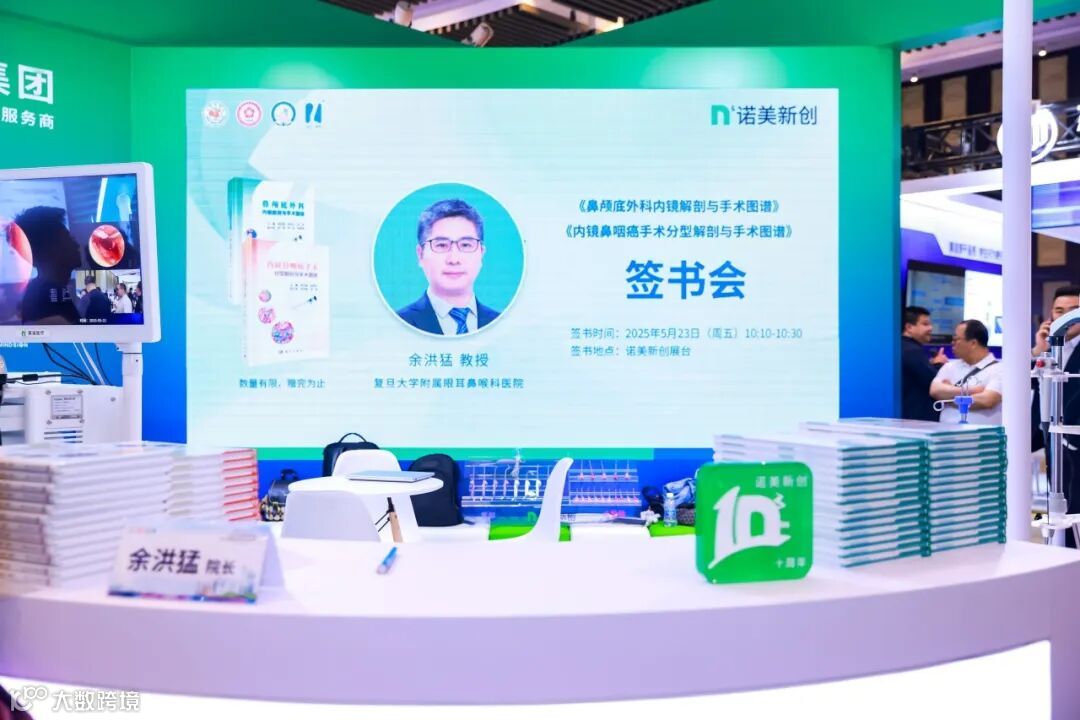 开幕式当天,复旦大学附属眼耳鼻喉科医院余洪猛教授莅临展台,现场签名并赠送其权威著作《鼻颅底外科内镜解剖与手术图谱》和《内镜鼻咽癌手术分型解剖与手术图谱》。