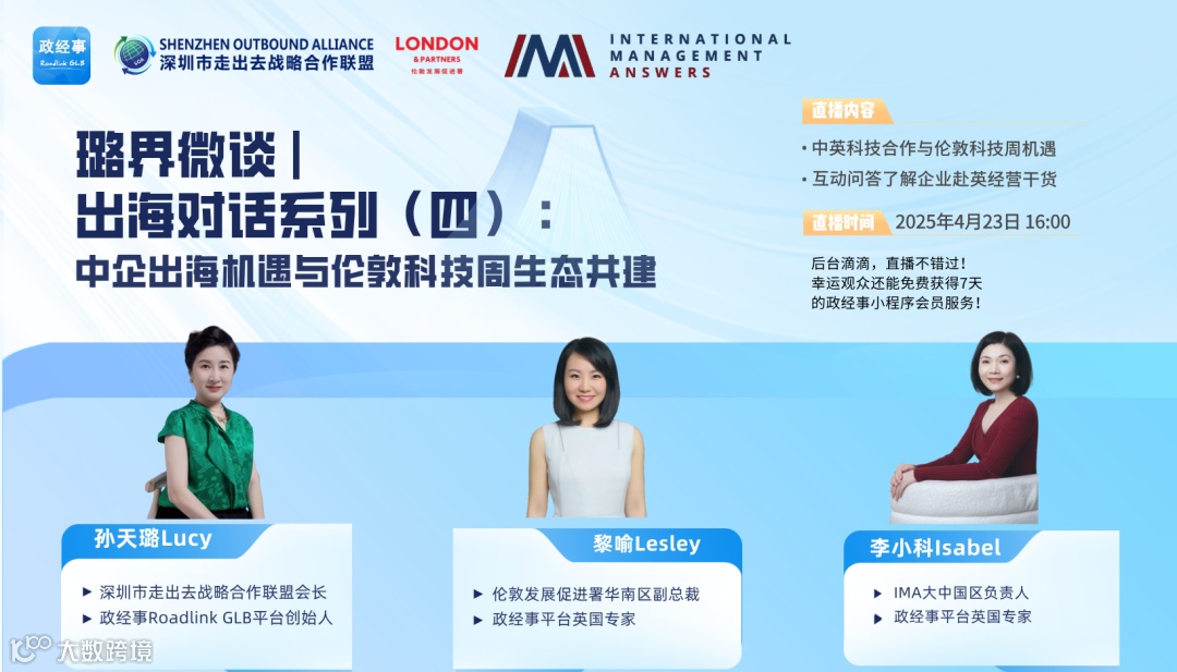 4月23日,本场直播邀请到我平台英国伦敦国际化专家、伦敦发展促进署华南区副总裁黎喻,平台英国专家、IMA大中华区负责人李小科,与我平台创始人孙天璐一同进行主题为“中企出海机遇与伦敦科技周生态共建”的直播对话,为大家解读英国伦敦科技周。累计吸引近2000名观众在线参与,收获2万次观众点赞评论等互动。