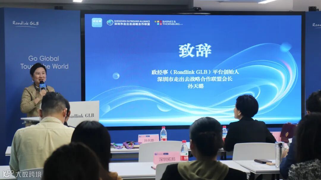 ▲ 政经事(Roadlink GLB)平台创始人、深圳市走出去战略合作联盟会长孙天璐--致辞