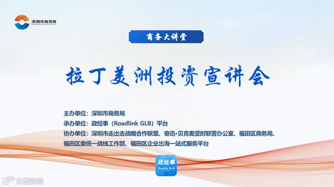 为助力企业把握拉美市场投资合作新机遇,深化中拉经贸往来与合作,应对多元化挑战,由深圳市商务局主办,政经事(Roadlink GLB)平台承办,深圳市走出去战略合作联盟、奋迅·贝克麦坚时联营办公室、福田区商务局、福田区委统一战线工作部、福田区企业出海一站式服务平台协办的『2025年深圳市商务大讲堂—拉丁美洲投资宣讲会』于2025年9月19日(星期五)下午14:00-18:00,通过线下会场+线上直播方式举行。拟参加的企业代表请提前扫码报名。