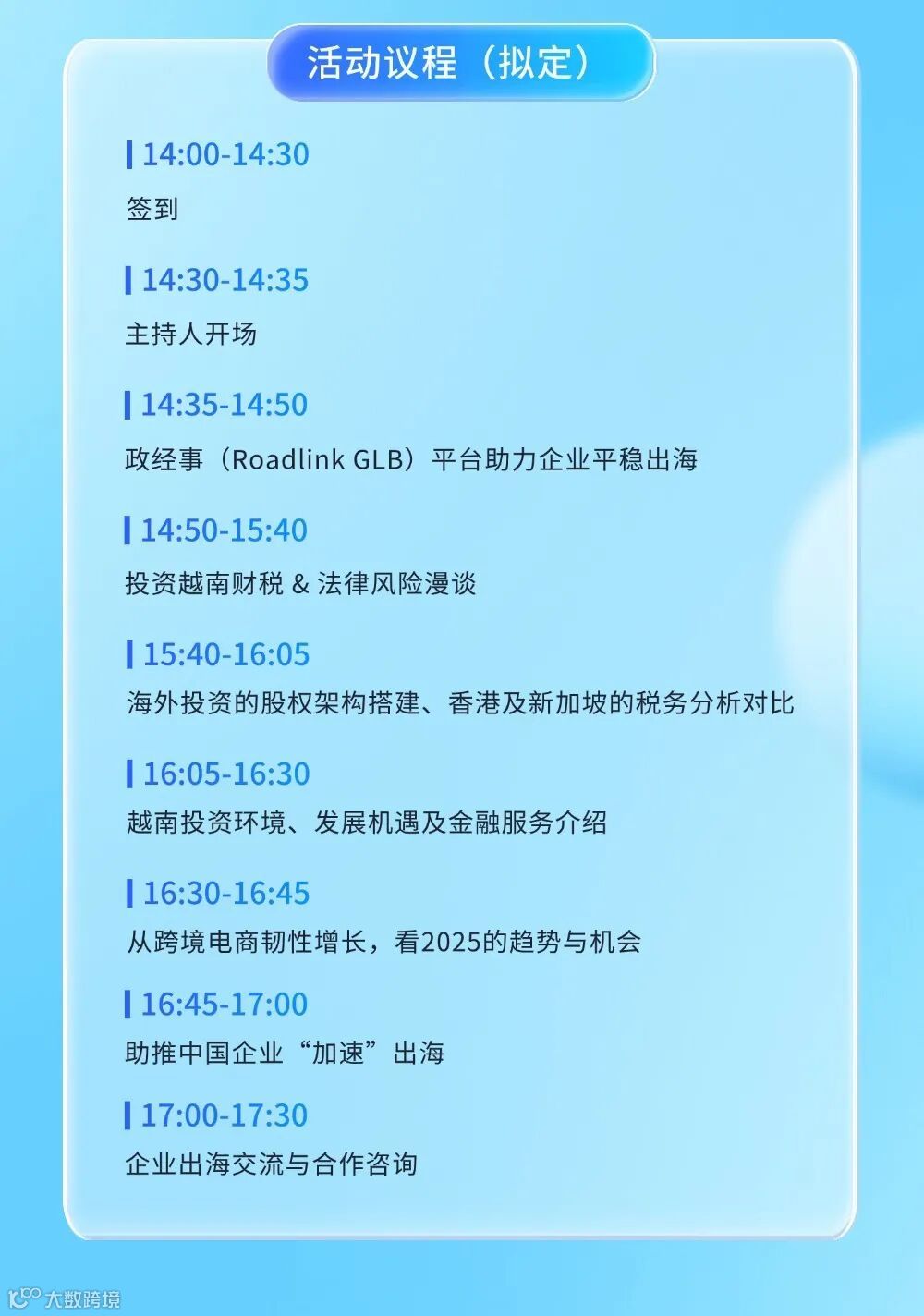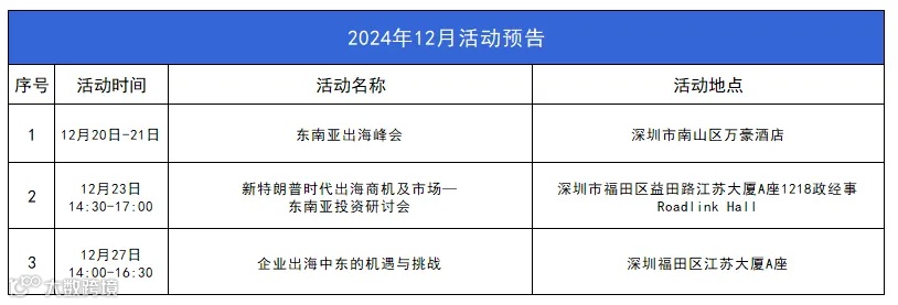 为了协助中国企业对海外投资的实务操作、相关风险和应对措施有更多了解,政经事(Roadlink GLB)平台与毕马威越南将于2024年12月23日在深圳举办“新特朗普时代出海商机及市场——东南亚投资研讨会”,届时有毕马威越南、政经事平台、新加坡兴业、中国银行(香港)胡志明市分行、越南知名律所南山律师事务所以及来自深圳市递四方速递有限公司和阿里云的重磅专家现场分享。欢迎企业点击“阅读原文”或扫描下方二维码报名参会。