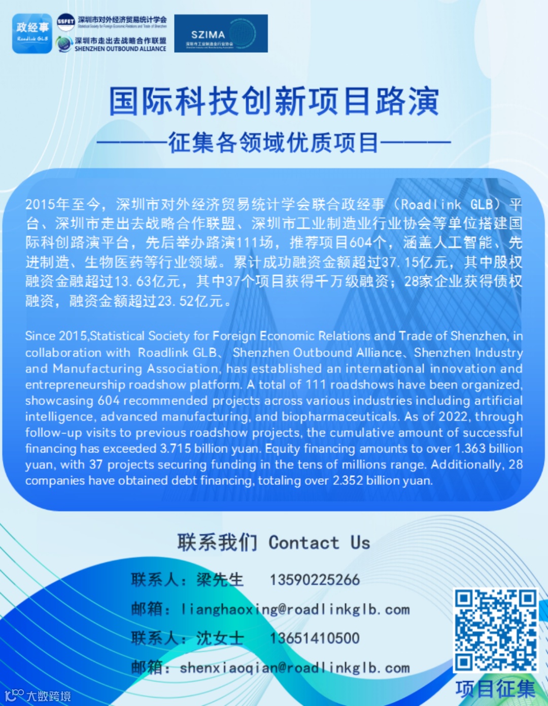 2024年6月25日,由深圳市龙华区国际合作中心主办,政经事(Roadlink GLB)平台承办的『龙华区服务企业国际化发展系列活动--国际科技创新系列项目路演(第60场)』将于深圳市龙华区国际合作中心举办。科技创新系列路演活动每月举办一场,每期路演涵盖四个项目,路演平台将在路演前为项目提供商业计划书指导及路演培训,会议通过“全球直播+线下会场”相结合的形式开展。欢迎有意参加的企业与我们联系。欢迎企业、金融机构点击“阅读原文”或扫描下方二维码报名参会。