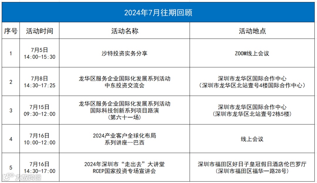 为了增强企业对外投资合规意识,降低投资风险,由深圳市商务局主办,政经事(Roadlink GLB)平台承办,深圳市走出去战略合作联盟、中国人寿保险股份有限公司深圳市分公司协办的『2024年“走出去”大讲堂—对外投资合规风险识别与防范宣讲会』将于8月1日(星期四)下午14:30-16:40举办,通过“线下会场+线上直播”形式展现。拟参加的企业代表请提前扫码报名。