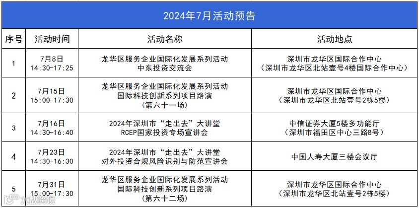 为加强企业对海外形势以及中东政策的了解,帮助龙华区企业把握投资机会,提升境外投资管理水平,促进龙华区企业与中东地区在多领域开展合作,由深圳市龙华区国际合作中心主办,政经事(Roadlink GLB)平台承办的『龙华区服务企业国际化发展系列活动——中东投资交流会』拟定于7月8日(星期一)下午14:30-17:25举办。拟参加的企业代表请提前扫码报名。