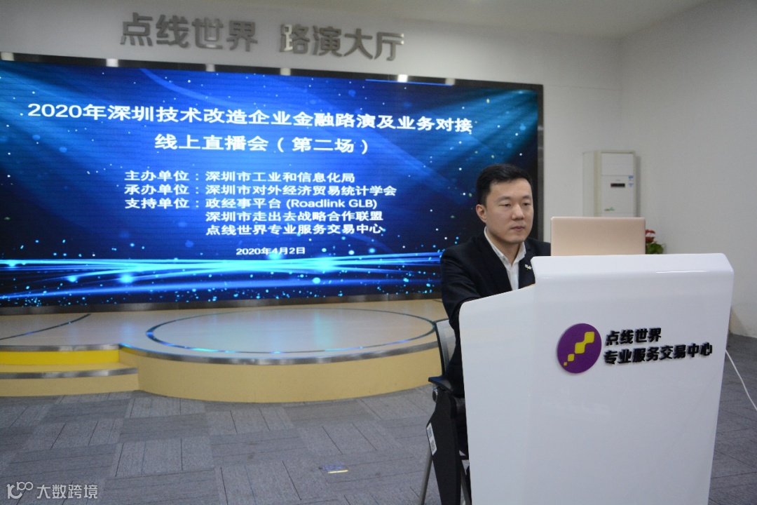 4月2日下午,由深圳市工业和信息化局主办,深圳市对外经济贸易统计学会承办,政经事平台(Roadlink GLB)、深圳市走出去战略合作联盟、点线世界专业服务交易中心支持的『2020年深圳技术改造企业金融路演及业务对接线上直播会(第二场)』顺利举行。