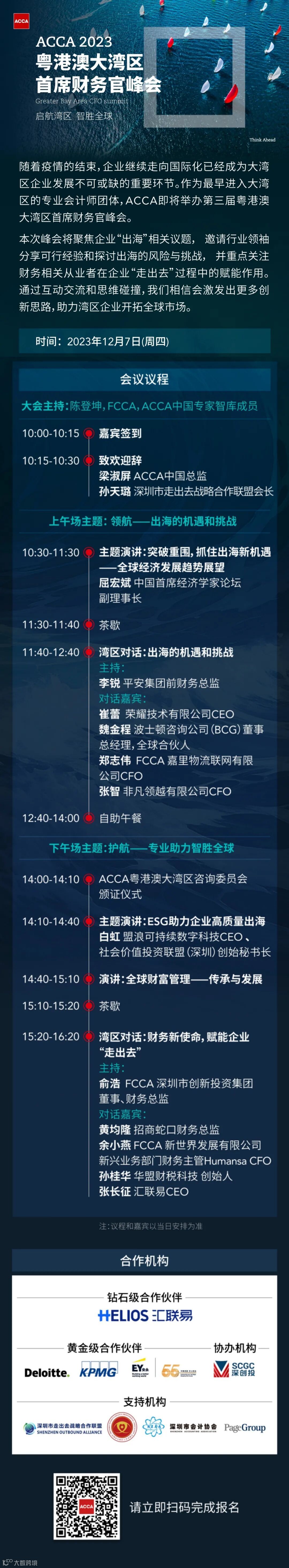 随着疫情的结束,企业继续走向国际化已经成为大湾区企业发展不可或缺的重要环节。ACCA即将举办第三届粤港澳大湾区首席财务官峰会。