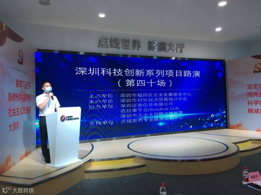 8月20日下午,由深圳市福田区企业发展服务中心主办,深圳市对外经济贸易统计学会承办,深圳证券信息有限公司、深圳市走出去战略合作联盟与政经事平台(Roadlink GLB)协办的『深圳科技创新系列项目路演第四十场』在深圳市福田区点线世界专业服务交易中心路演大厅顺利举办。