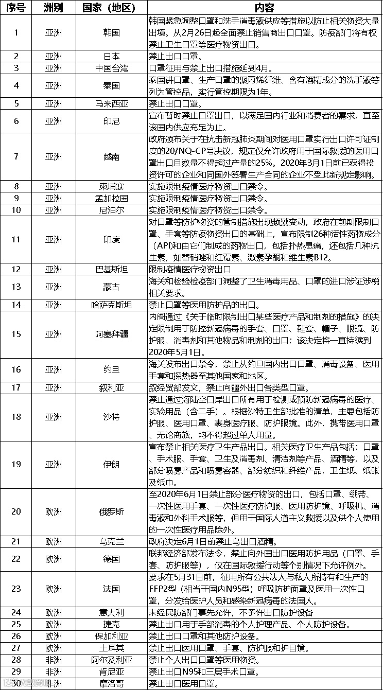 本期简报基于国内外公开信息综合搜集整理了截至目前最新的海外针对口罩等防疫医疗物资出台相关管控措施,并对这些信息进行分类梳理和总结。