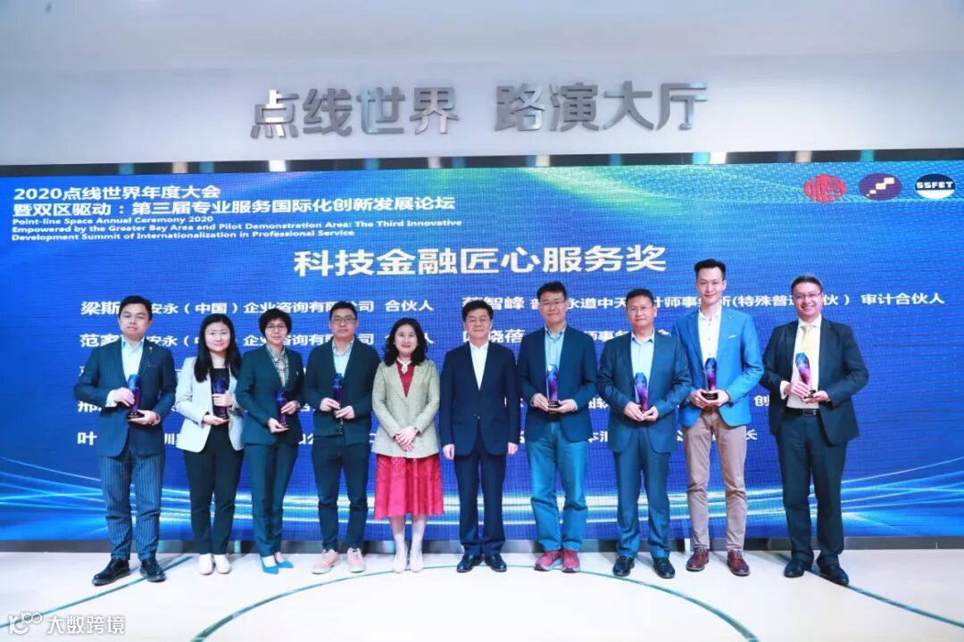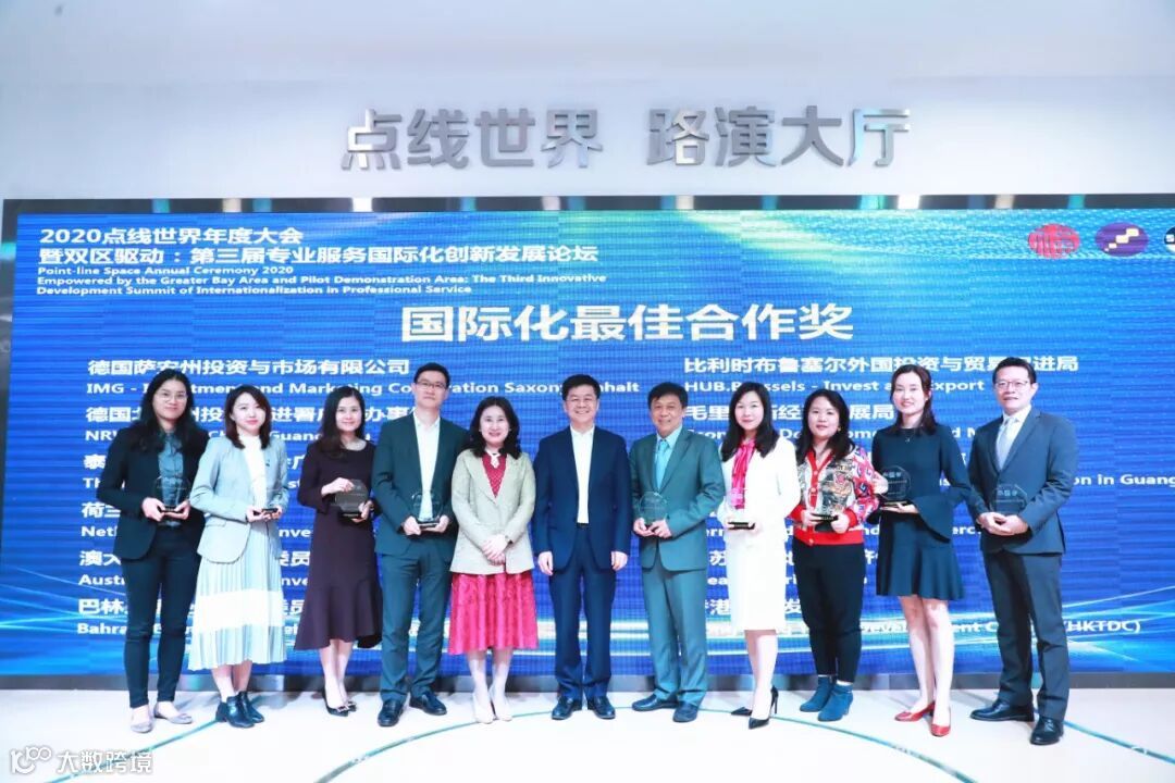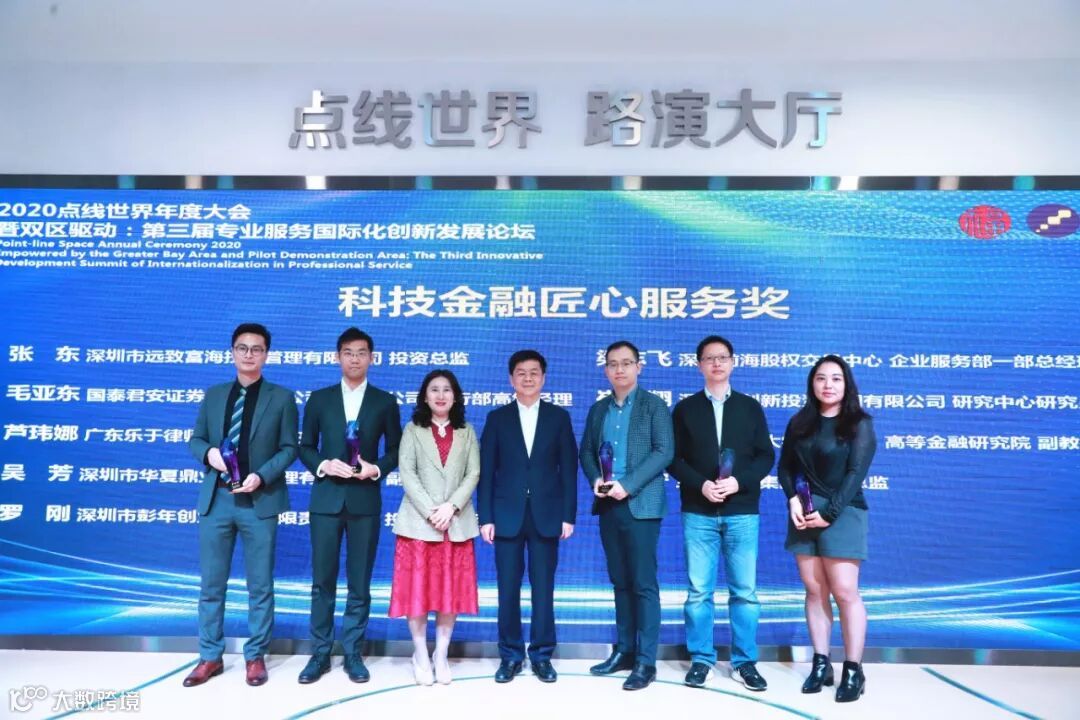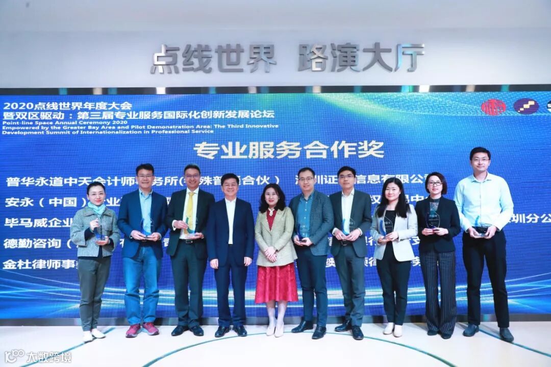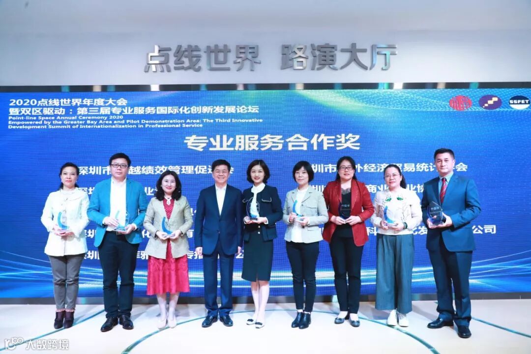 点线世界专业服务交易中心致力于打造一个国际化专业服务平台,通过导入国际服务体系,帮助企业对接海外资源,加速企业国际化发展,进而助推一带一路建设。三年来取得的成绩,既离不开福田区企业发展服务中心的支持和信任,也与长期支持和合作的外国机构、优秀企业、行业协会、知名专业机构以及各专家团队密不可分。大会现场,冯主任和孙会长为和点线世界一同携手发展的机构、企业、协会、专家分别颁发国际化最佳全球合作奖、专业服务合作奖和科技金融匠心服务奖。(以下排名不分先后)