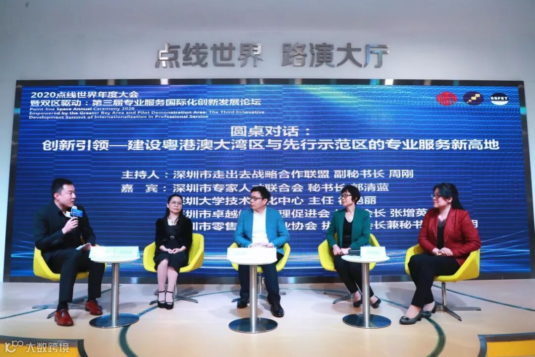 在圆桌对话环节, 由深圳市专家人才联合会秘书长郭清蓝、深圳大学技术转化技术中心主任徐艳丽、深圳市卓越绩效管理促进会执行会长张增英、深圳市零售商业行业协会执行副会长兼秘书长谢永明就主题《创新引领-建设粤港澳大湾区与先行示范区的专业服务新高地》进行讨论分享,圆桌对话环节由深圳市走出去战略合作联盟副秘书长周刚主持。
