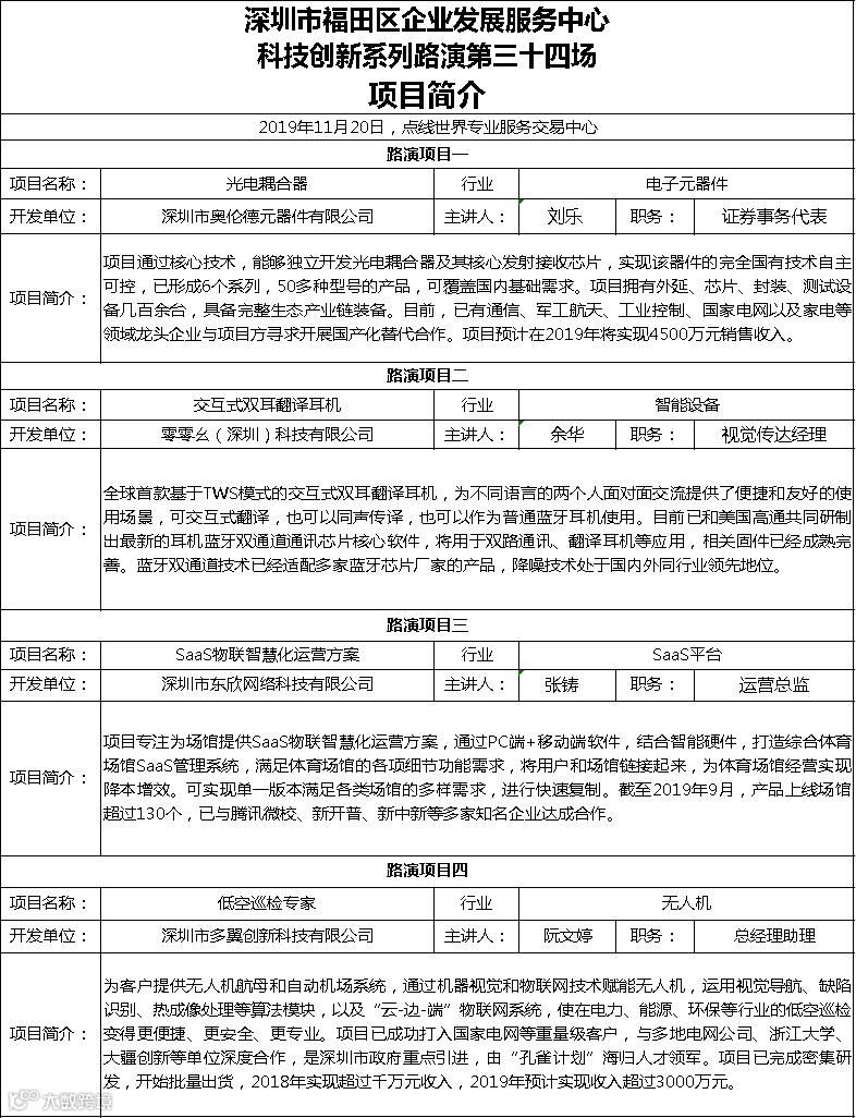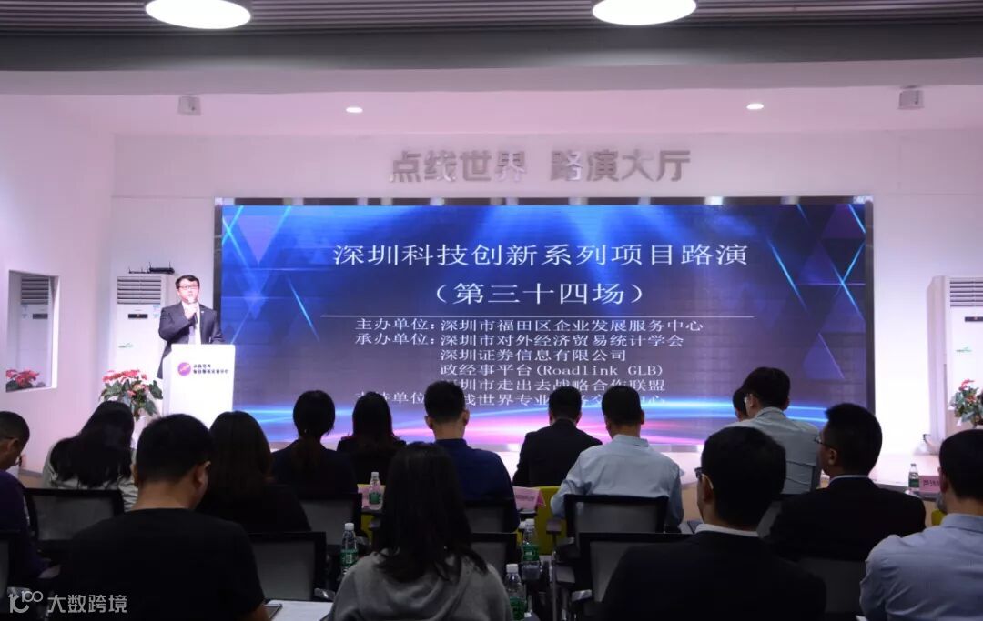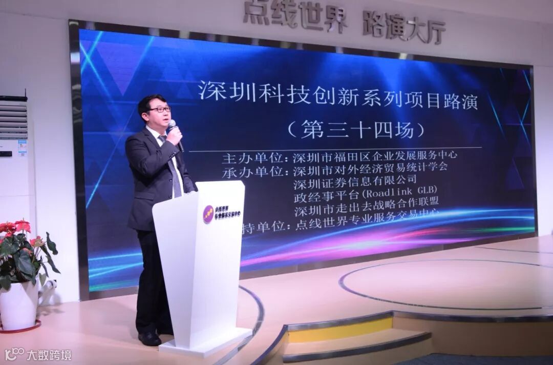 11月20日下午,由深圳市福田区企业发展服务中心主办,深圳市对外经济贸易统计学会承办,政经事平台(Roadlink GLB)、深圳证券信息有限公司、深圳市走出去战略合作联盟协办的『深圳科技创新系列项目路演第三十四场』在深圳市福田区点线世界专业服务交易中心顺利举办。