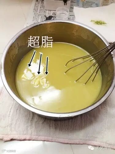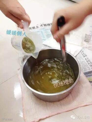 将制作好的B缓缓到入A中,让油品和碱水产生皂化反应。这个步骤的制作诀窍是缓缓倒入+快速搅动!