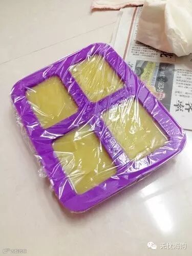 将皂液倒入香皂模型盒中,并以保鲜膜包好。