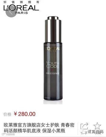 L'Oreal Paris Youth Code Serum Intense欧莱雅青春密码精华液30ml(欧莱雅小黑瓶),是欧莱雅历经10年基因研究所推出的抗皱精华液,能在4周时间内有效改善压力,疲劳等引起的衰老症状质地温和,通过皮肤温和测试涂抹后肌肤即刻如丝般光滑,并为肌肤制造柔焦效果早晚使用效果最佳,每次使用1-3滴,涂抹于脸部和颈部。