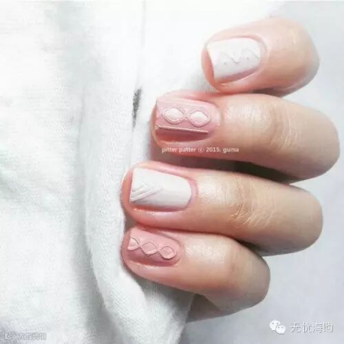 涂上粉嫩的指甲颜色,最为适合。感觉就像真的毛衣一样软绵绵的,变身温暖系美甲!