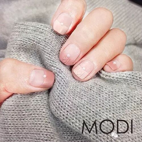 上图同样也是编织毛衣美甲,只是加入了法式指甲概念+小珍珠装点做变化,是不是看起来非常温柔而有女人味呢?