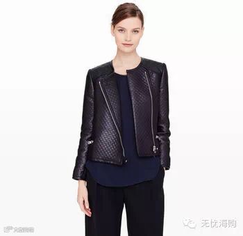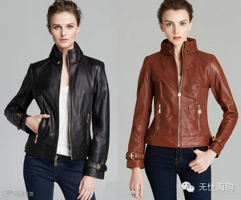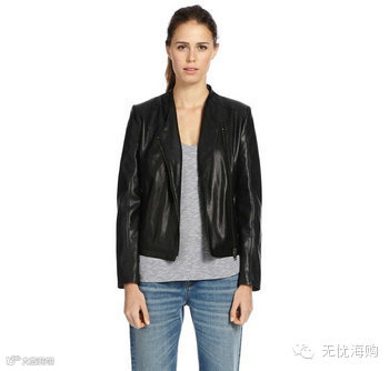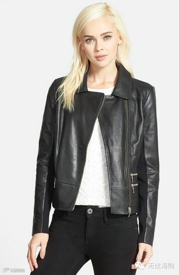 Via Spiga Women's Leather Jacket With Rusched Side Panels and Gold Hardware女士真皮夹克,采用柔软的小羊皮制作,短款全拉链设计,修身裁剪,整体风格略显野性。