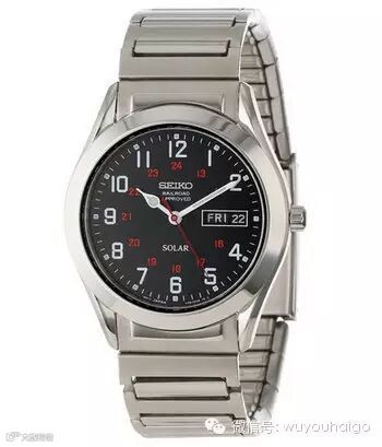 这款型号SNE179的精工男士太阳能手表,黑色表盘搭配银色夜光指针,不锈钢表盘和表带,外观稳重大气,