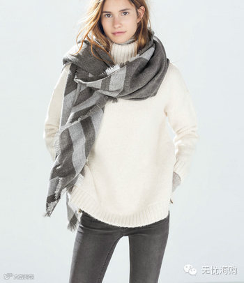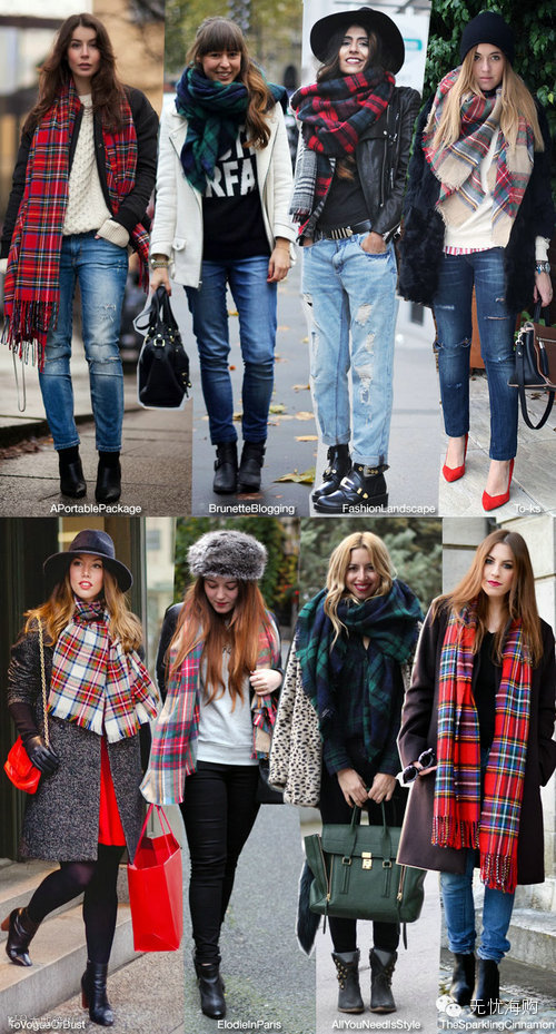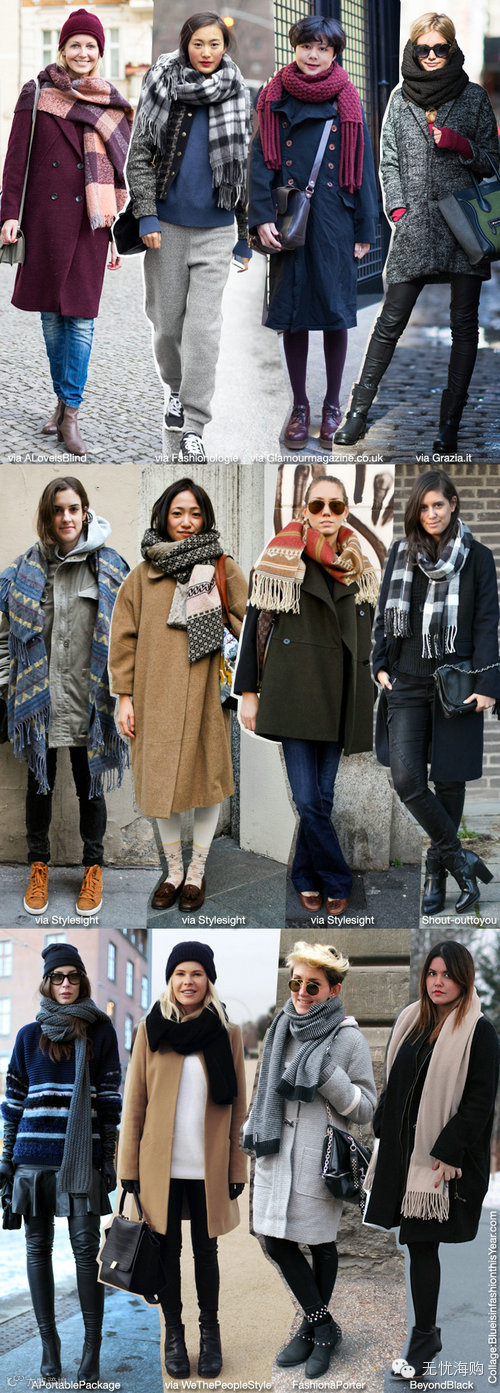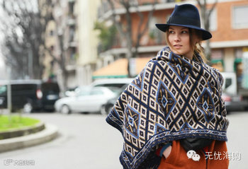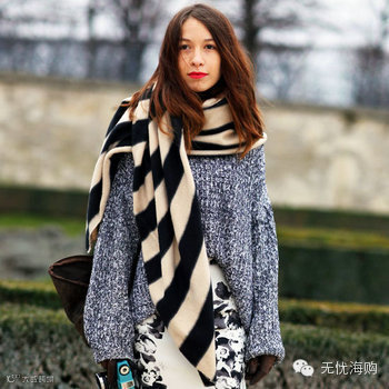 毛毯类,一定要把上半身全裹起来才有味道;图案的选择上,条纹,格纹是最好搭配的,驼色,灰色都是秋冬的万能色: