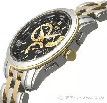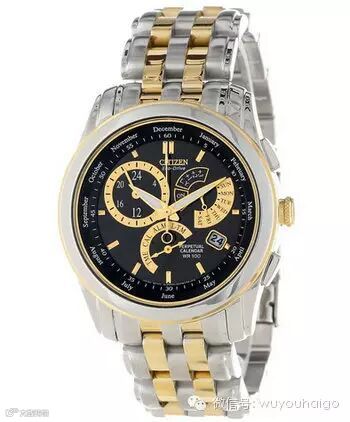 Citizen 西铁城BL8004-53E光动能万年历男表,黑色表盘搭配三眼六针的金色小表盘,以及间金表带很显档次,黑金搭配是最经典的配色之一。