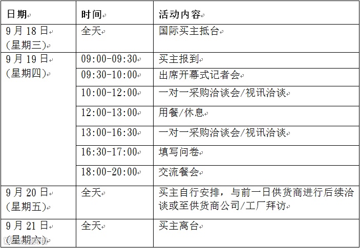 采购洽谈会采一对一方式进行。买主将被安排与8~10家供货商进行采购洽谈,每洽谈场次时间为30分钟。
