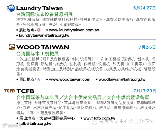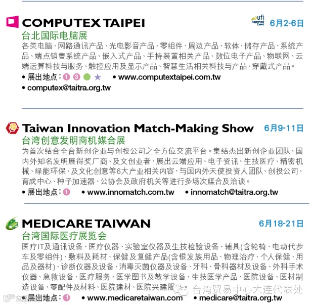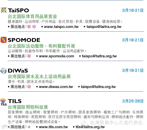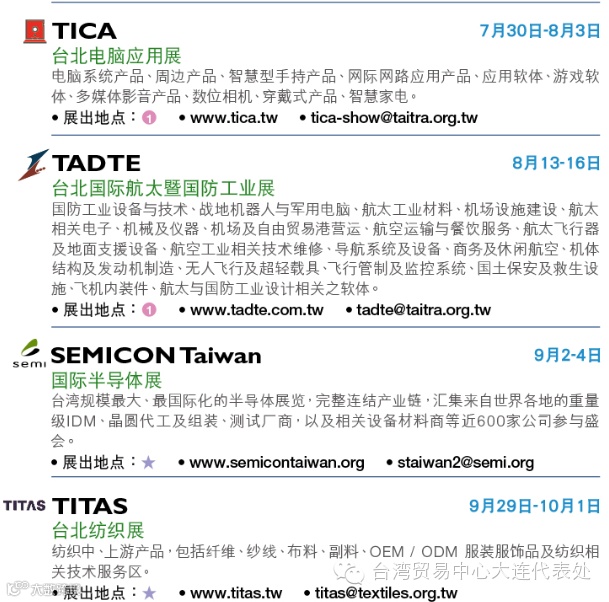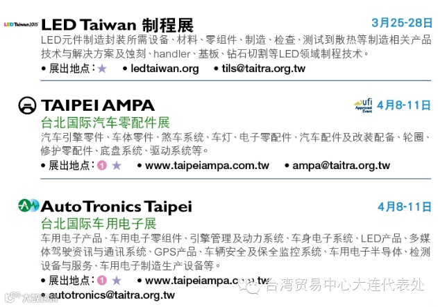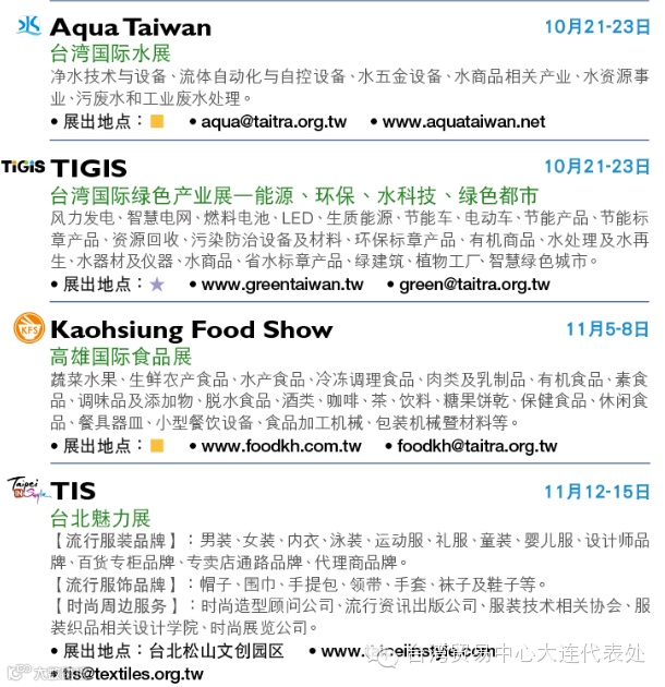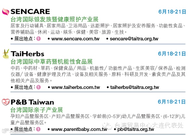预了解展会详情或报名观展欢迎洽询台湾贸易中心大连代表处