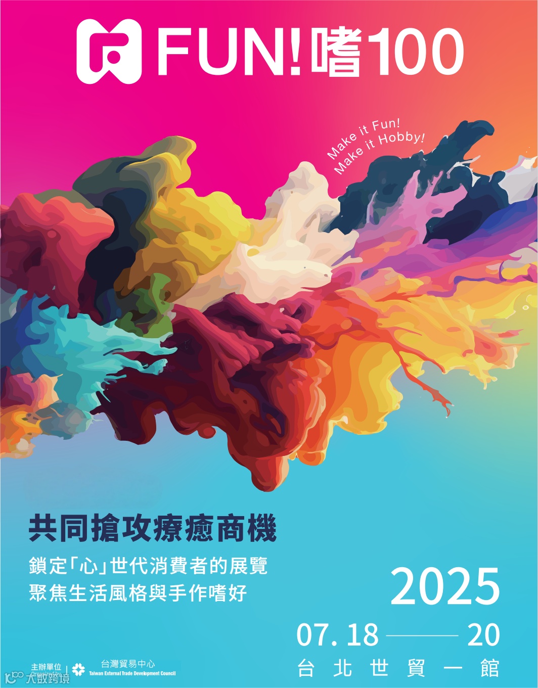 体验经济崛起,风格品味、嗜好相关的新兴消费形态快速成长。为抓住这股风潮,台湾贸易中心于暑期黄金档期推出「玩、买、逛、看」兼具的体验型展览「FUN!嗜100」,将于2025年7月18日至20日在台北世贸一馆盛大开展,以「FUN手作,FUN胆玩」理念,打造手作及嗜好热衷者的夏日嘉年华,质感选物品牌、文创手作、职人工艺厂商及创作者积极参展,拥抱体验经济商机。让参观民众透过购买生活选物来表达自我,并形塑生活风格美学,也可沉浸在手作课程以满足兴趣与享受疗愈过程。