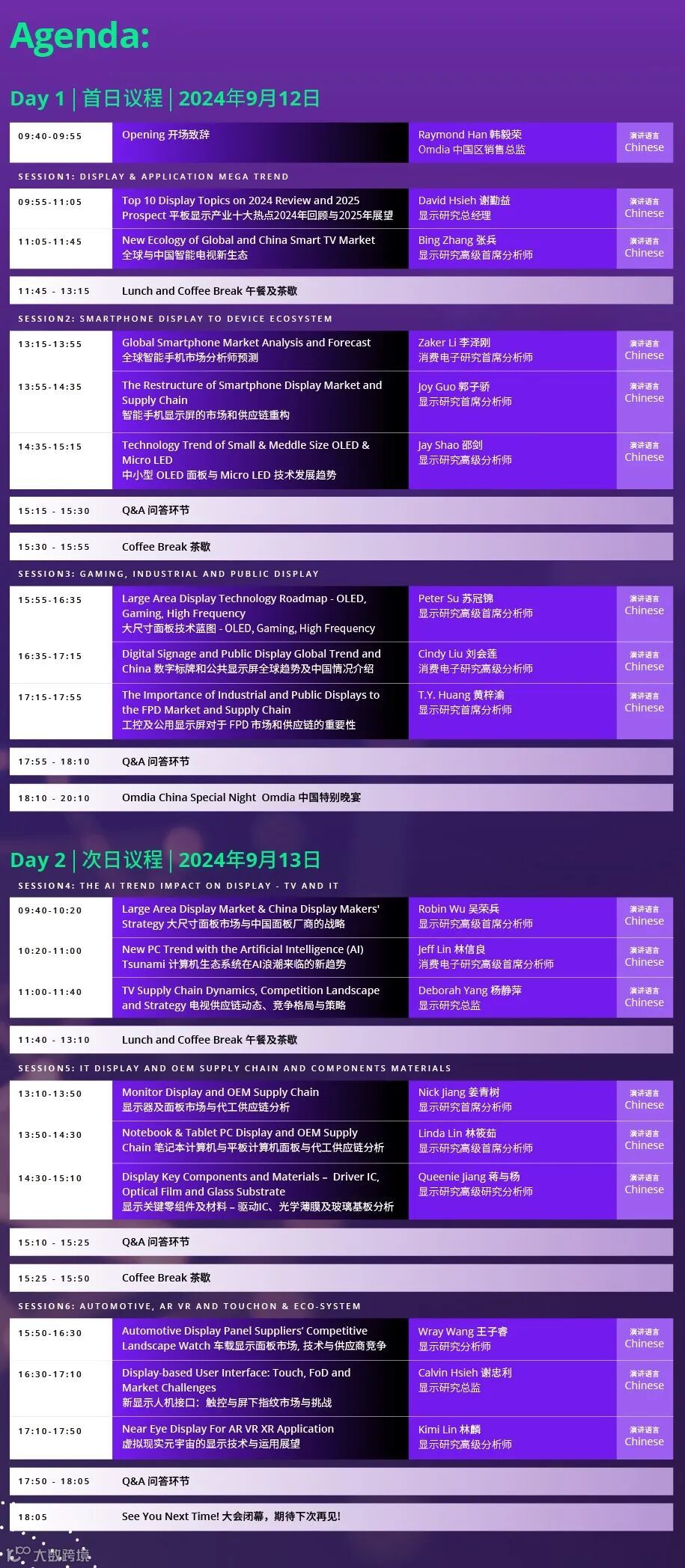 2024年的会议日程已全面升级,包含独一无二的12小时满满干货的学习机会。研讨会全程中文进行,覆盖显示供应链及下游的应用市场,聚焦中国企业最关心的问题,深度剖析六大领域的17个显示产业热门议题。