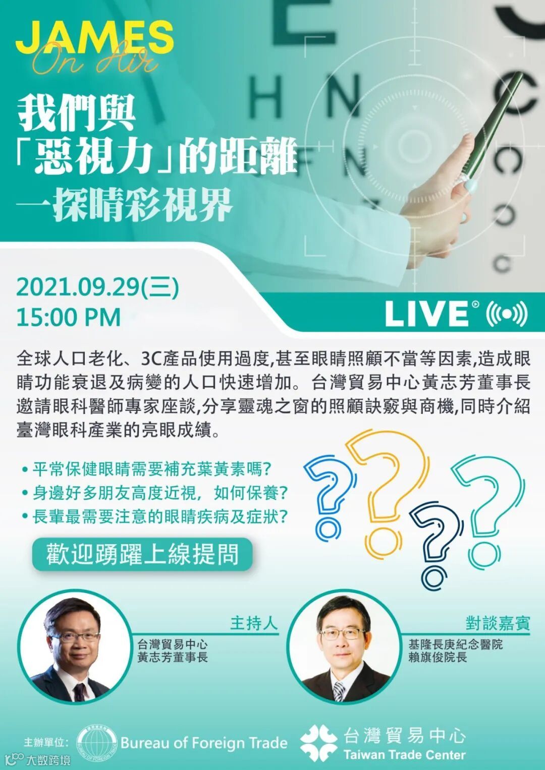 台湾贸易中心将于9月29日15:00办理「我们与「恶视力」的距离—一探睛彩视界」线上座谈交流会。活动邀请国际知名的黄斑部病变及白内障手术专家-台湾眼科权威名医基隆长庚纪念医院赖旗俊院长,分享灵魂之窗眼睛的保养照顾诀窍与正确的治疗方式,同时介绍台湾眼科产业的亮眼成绩。