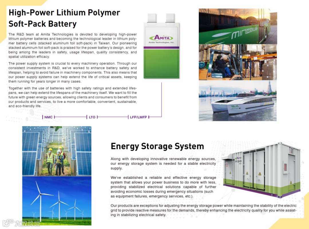 公司简介:创立于2011年,宗旨是「爱地球」,致力发展环保、节能、减碳、安全的绿色产品,并专注在动力及储能材料、组件、系统等专业领域上的技术开发与创新。公司经营团队由台湾科技大厂的精英专才与具有高瞻远瞩的企业经营者,并集结对储能材料、电池及电动车领域极具热忱的研发团队组成,已投注十年以上的时间在绿色能源及储能系统的研究发展,拥有绿色材料技术开发能力、奈米化粉材研磨及分散技术等专利。2018年为台湾电动公交车最大供货商,供应2021年电动公交车需求的50%以上。