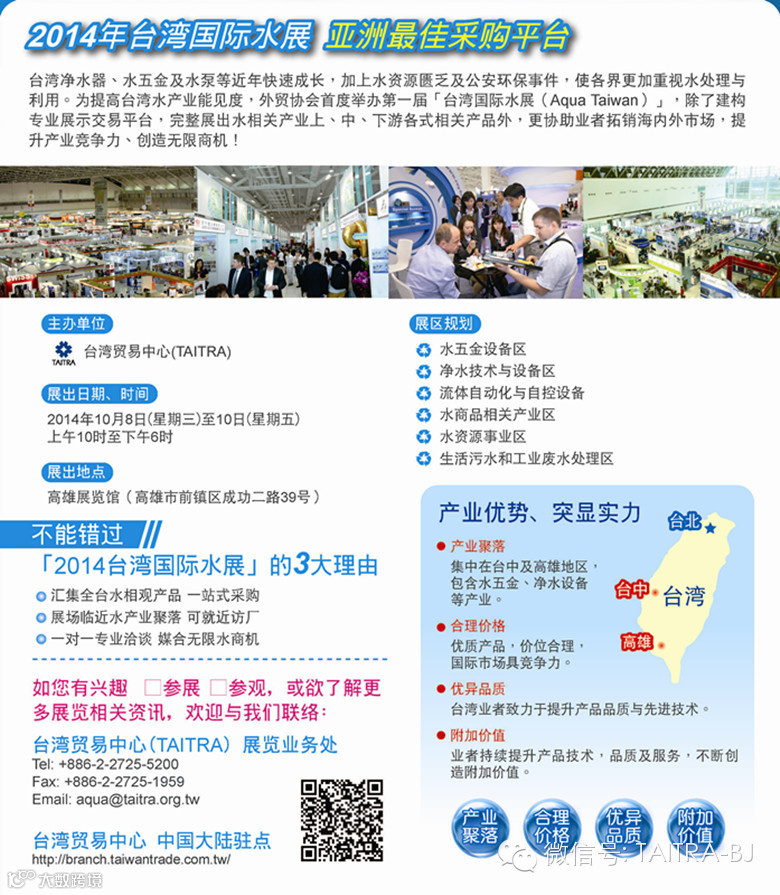 台灣貿易中心訂於2014年10月8日至10日假高雄展覽館首次舉辦「2014年台灣國際水展」,目前已徵集130家廠商參展,使用230個攤位。該展展區規劃為「淨水技術與設備」、「水五金」、「生活污水和工業廢水處理」、「流體自動化與自控設備」、「水資源事業」、「水商品」等區; 展品則涵蓋泵閥管表、水處理技術與設備、自動化控制、濾膜、藥劑、水龍頭、包裝水、及水資源技術與設備等。