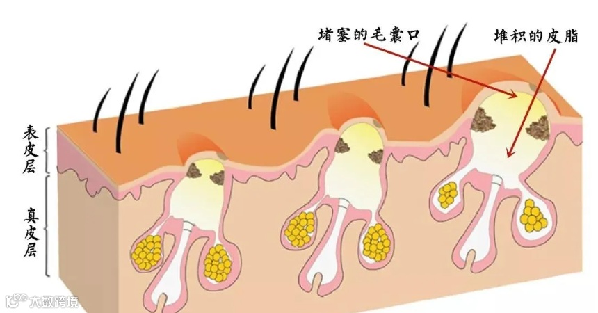 ①皮脂腺分泌过多油脂形成堆积,毛孔堵塞无法排出,导致油脂粒硬化。