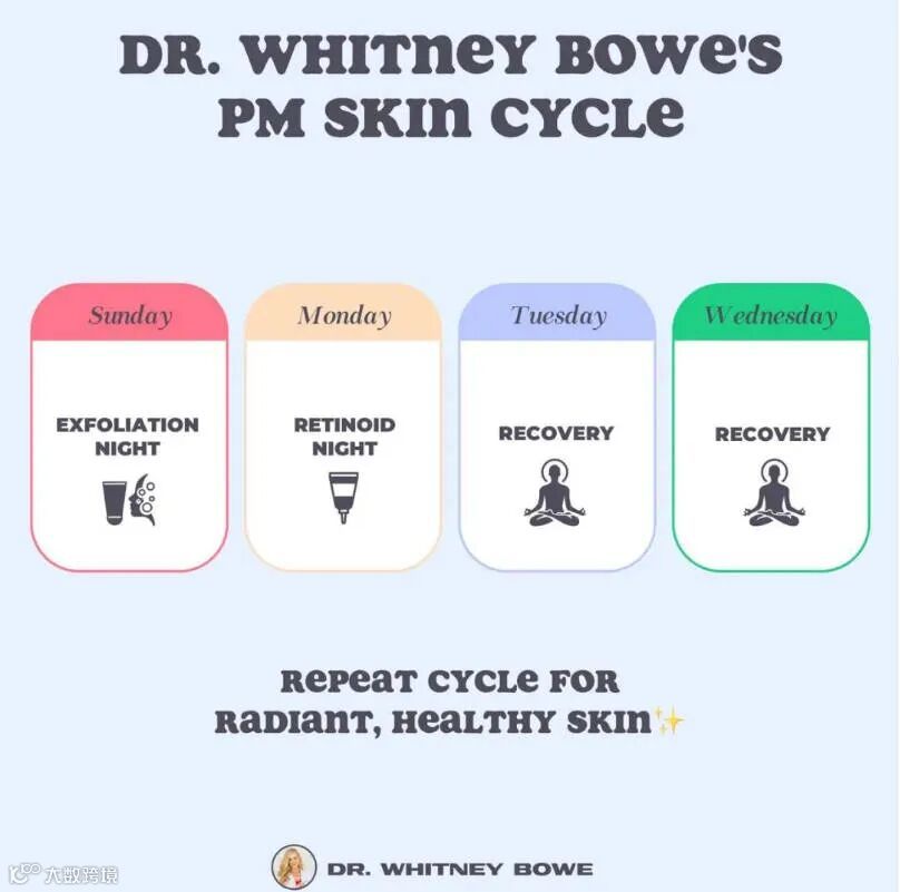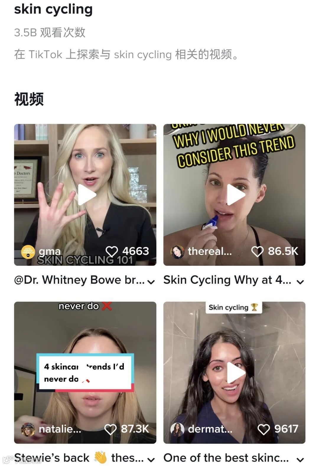 从去年起到今年在国外特别流行一个叫“Skin Cycling”,也就是循环护肤法,在海外抖音上真的火到爆!并且引起了一些专业、知名的皮肤科医生关注和肯定。给肌肤设置“休息日”,通过加强保湿、增强屏障保护功能的护肤品进行精准的修护,以更好的状态接受如视黄醇、果酸等护肤品为皮肤带来的焕新改变。