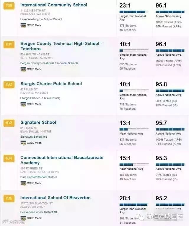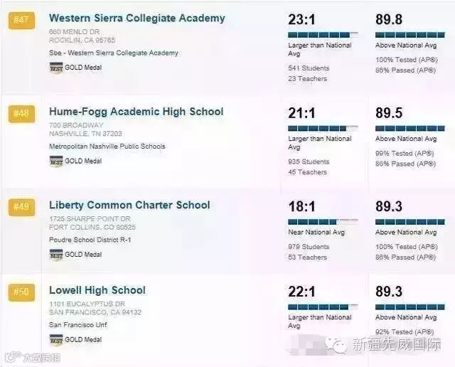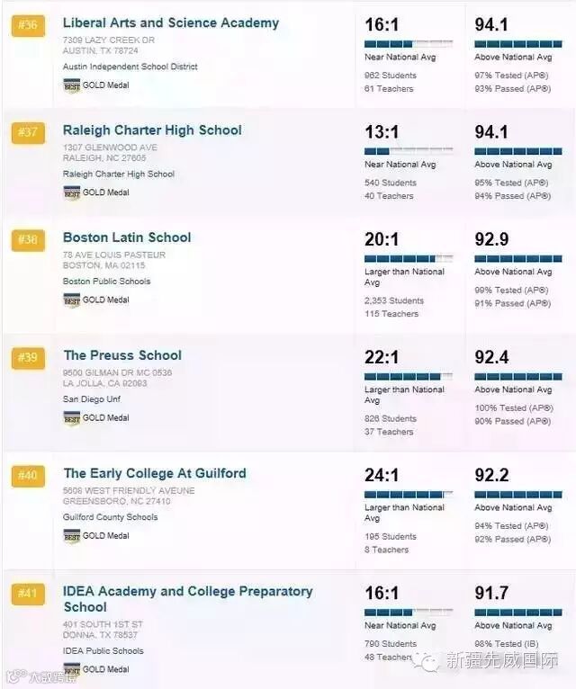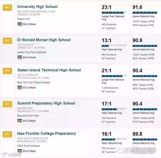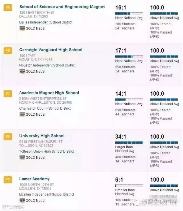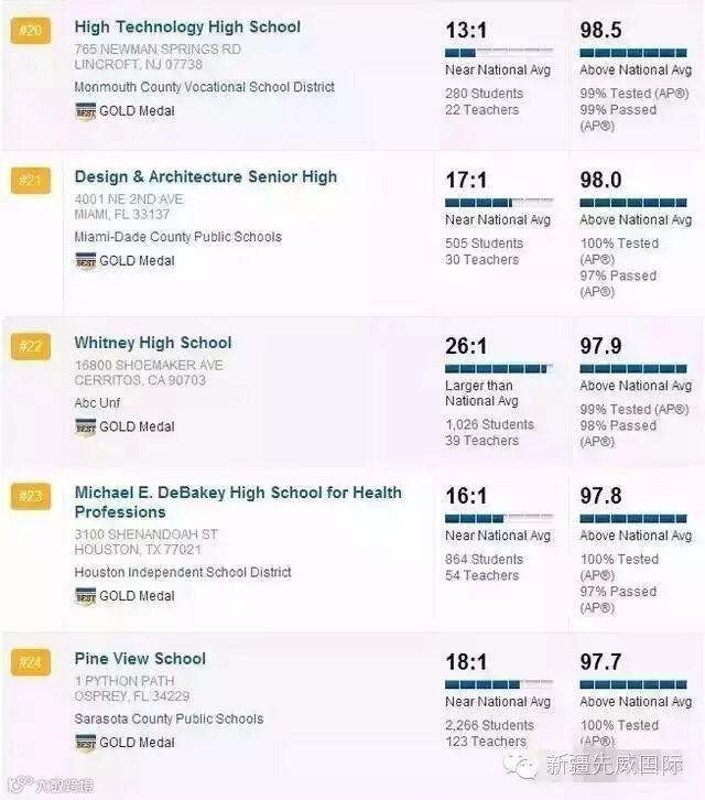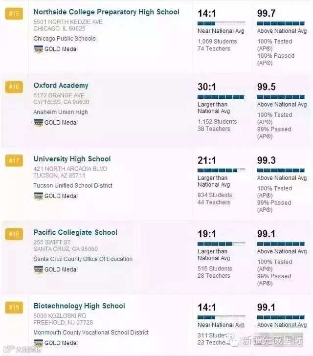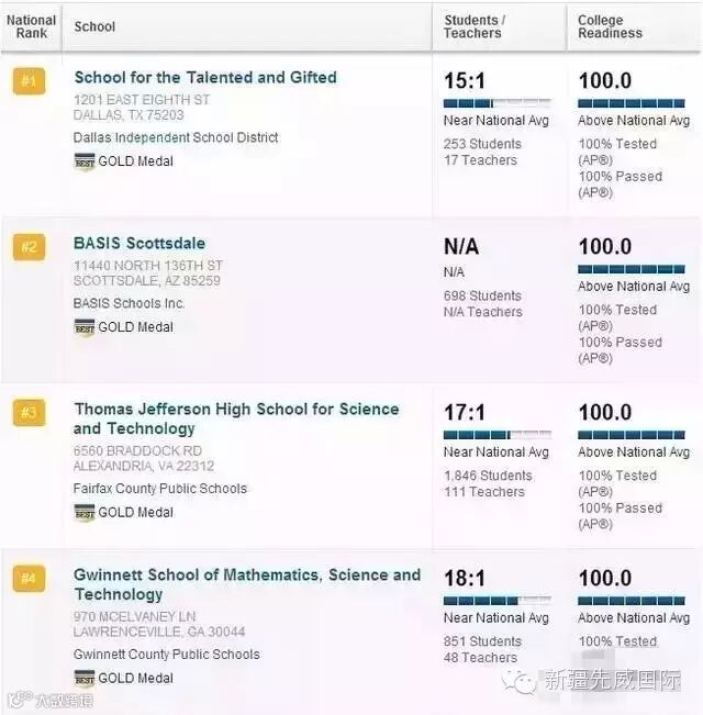 本次榜单最早调查范围包括全美50个州及哥伦比亚特区的29,070所公立高中。不过由于一些高中由于规模太小,所以并未列入考察的范围内,最终进入榜单的学校数量为19,753所。进入Top100的名单的高中,仍然集中于纽约、迈阿密、休斯敦、旧金山等美国主要城市。排名第一的天才学校(The School for the Talented and Gifted)位于达拉斯州。而在前100名学校中,德克萨斯州占据最多。其次是加州与纽约州。