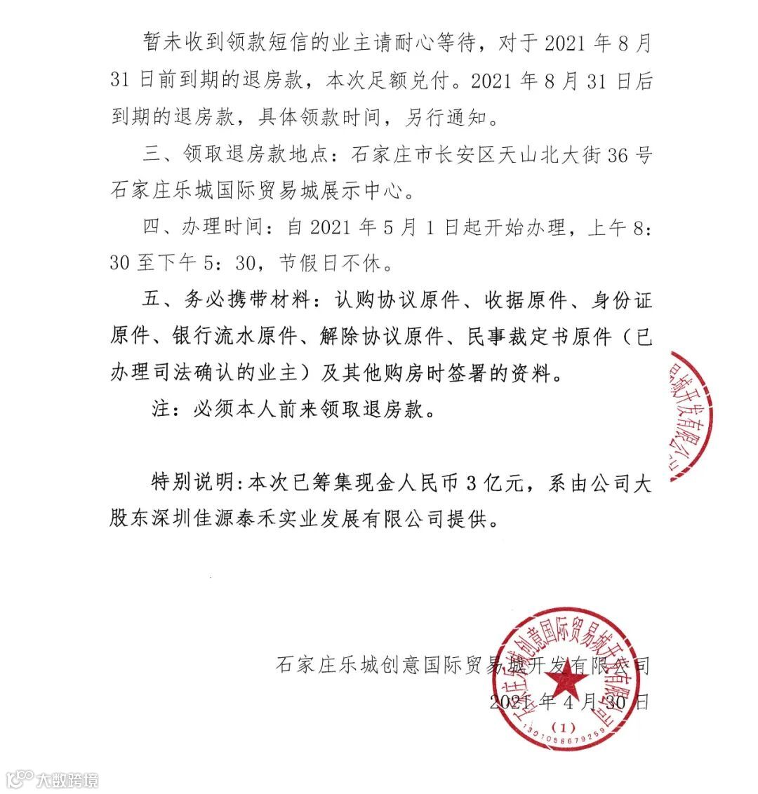 三、领取退房款地点:石家庄市长安区天山北大街36号石家庄乐城国际贸易城展示中心。