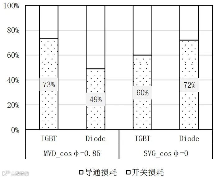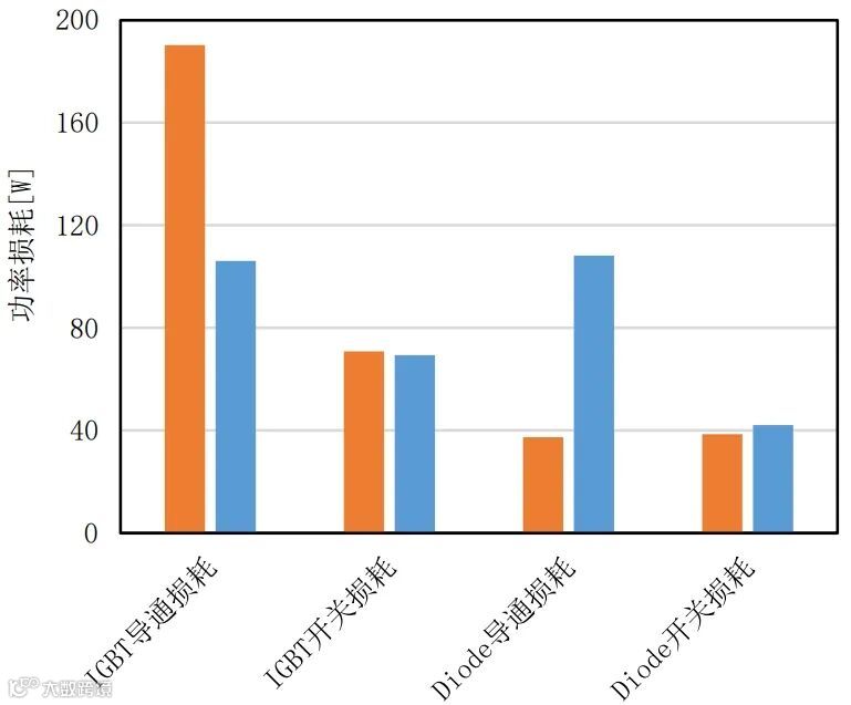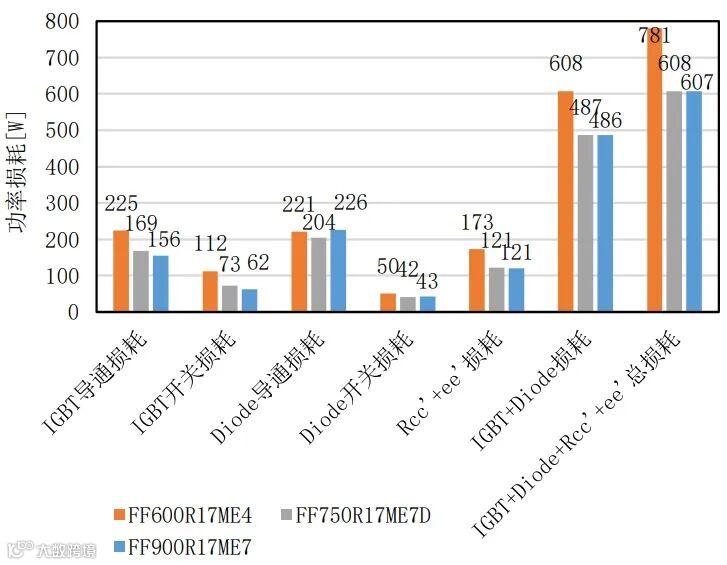图16.水冷SVG中FF600R17ME4,FF750R17ME7D和FF900R17ME7的损耗(一个IGBT和一个反并联二极管),输出电流500A