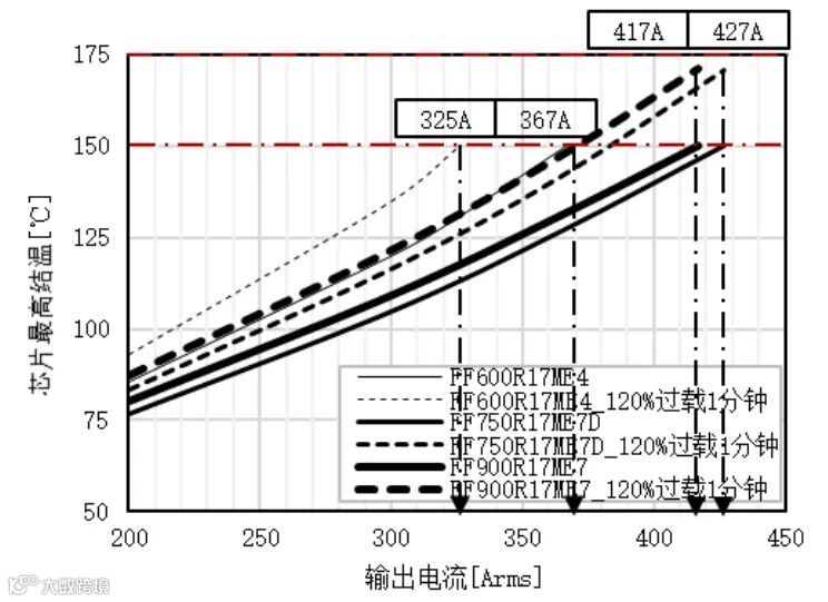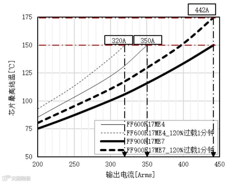 图11为风冷MVD的输出电流和IGBT最高结温的仿真结果,包括了额定工况和过载工况。结温为150度时,两种器件的额定输出电流分别为350A和442A。FF900R17ME7比FF600R17ME4高92A,大约26.3%。考虑FF900R17ME7具有1分钟的过载结温,额定输出仍为442A时,过载结温大约为175度。刚好充分利用了25度过载结温。为了使FF600R17ME4的过载结温不超过150度,其额定输出电流需要降低到320A。所以,过载工况时FF900R17ME7的输出比FF600R17ME4高122A,大约38.1%。