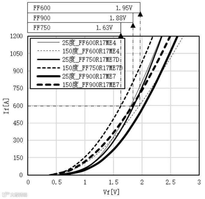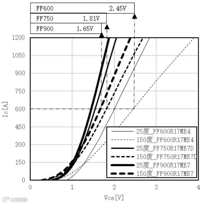 图5.IGBT4和IGBT7的导通特性曲线,图表上方的数值为三种器件的Vce值,条件为:Ic=600A,Vge=+15V,Tvj=150℃