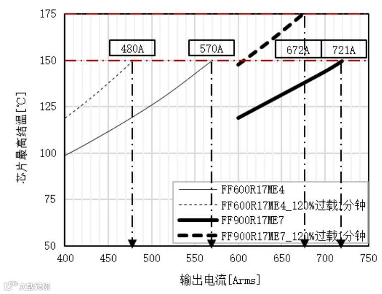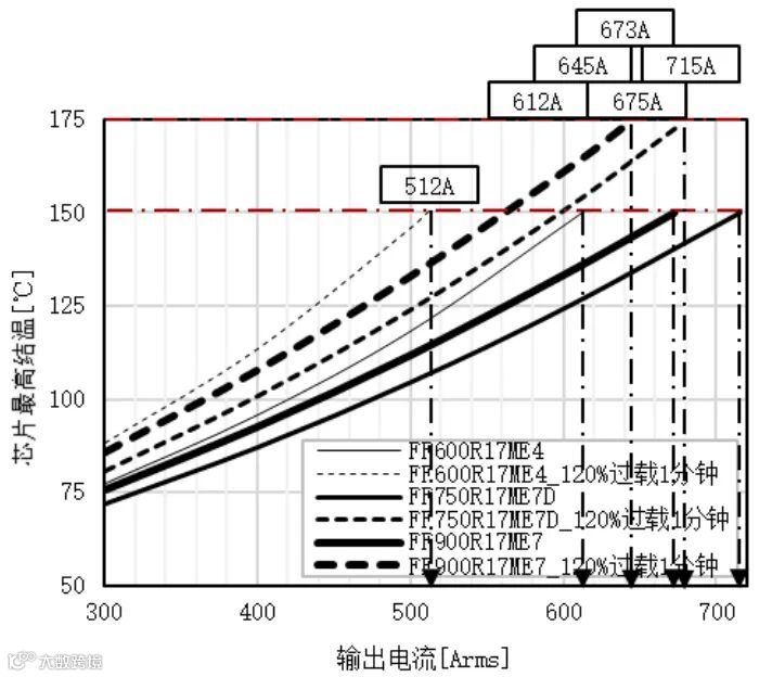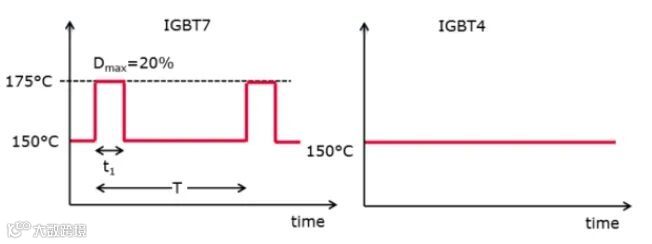 图7.IGBT7和IGBT4芯片允许的工作结温,IGBT过载结温最高175℃,IGBT4最高结温150度